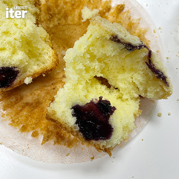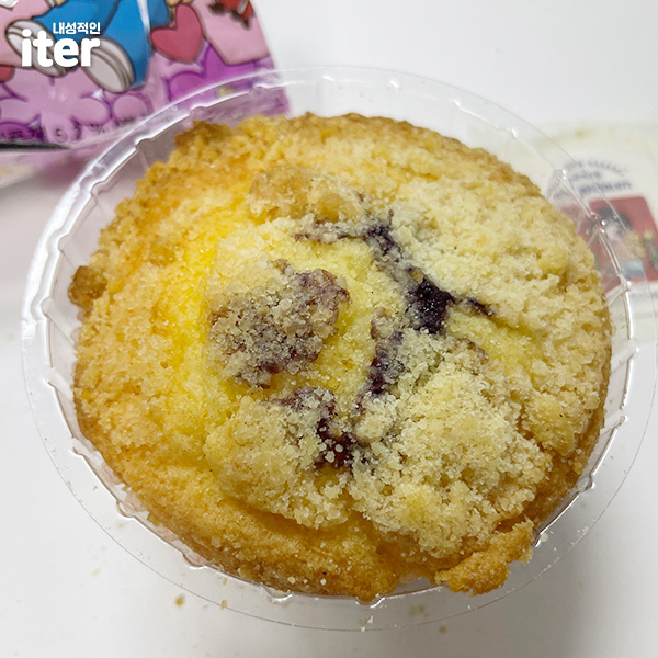 소보루 위에 올라가져 있는 느낌의 식감과 속을 보면 블루베리잼도 있어서 새콤하고 달콤하고 고소한 빵입니다. 머핀을 좋아하는데 이건 2천원의 느낌보다는 더 가격이 나가는 퀄리티 있는 느낌의 빵입니다! 너무 맛있습니다! 왕 추천!