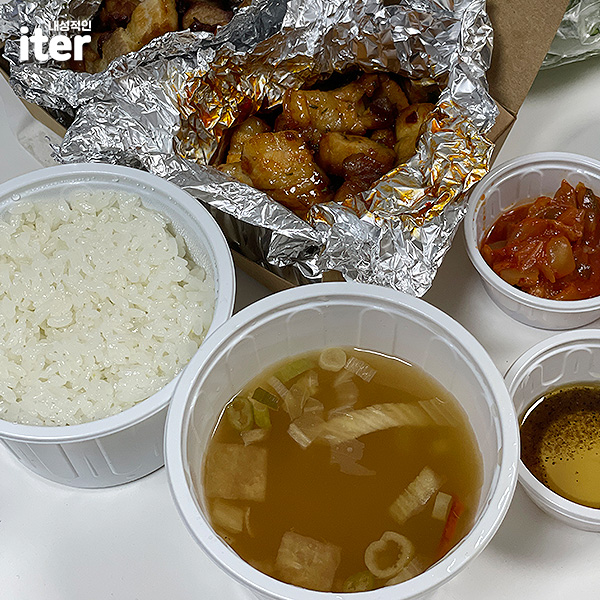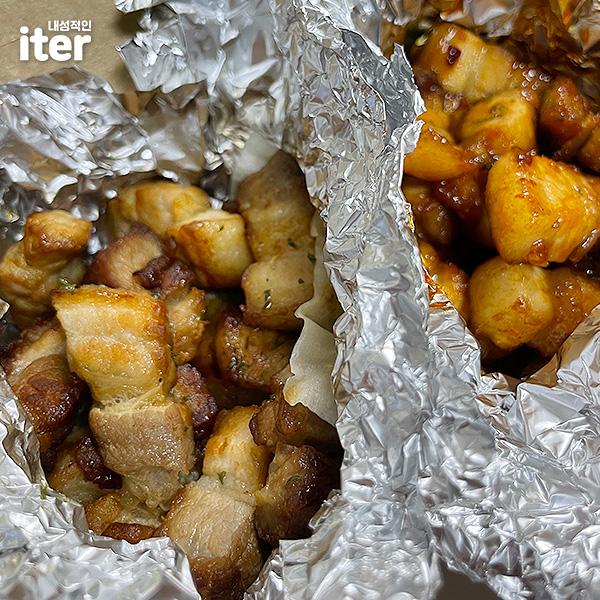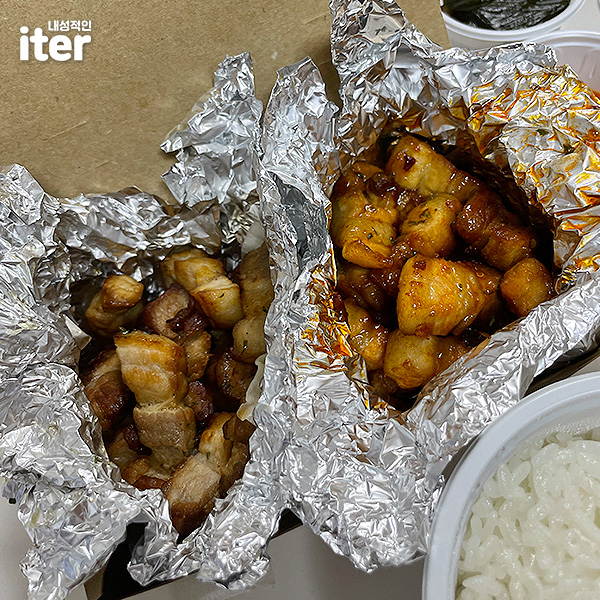 저는 혹시 몰라서 반반 삼겹으로 시켜보았는데요... 그냥 삼겹은 고기가 식으면서 좀 많이 딱딱한 느낌이 들어서 1~2조각은 남겼고, 양념 삼겹이 제일 맛있어요! 근데 지금은 반반 삼겹 메뉴가 없어진 듯하네요ㅜ 아무튼 양념 삼겹은 진짜 맛있었던! 양념 삼겹으로 밥 한 공기를 뚝딱 해치웠답니다! 다음에도 시켜먹을 기회가 있다면 양념으로 먹을 것 같아요!
