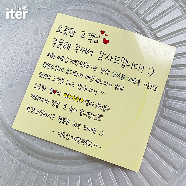 배달을 시키면 이런 쪽지 같은 게 올 때마다 작은 거지만 너무나 기분이 좋더라고요.
