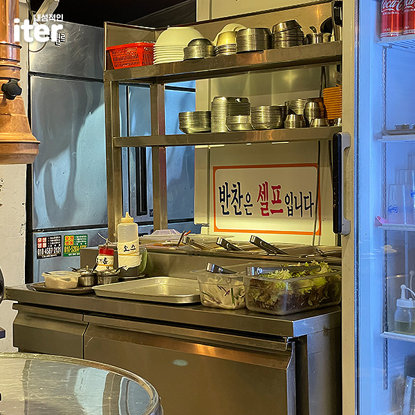 고깃집은 항상 보면 반찬 셀프바가 있는 것 같습니다. 명지돈에도 있더라고요. 전체적인 테이블이 포장마차? 느낌이어서 더 좋았는데 먹을 반찬은 직접 먹을 만큼만 가져다 먹는 것도 너무 좋았습니다. 술도 알아서 꺼내가면 됩니다.