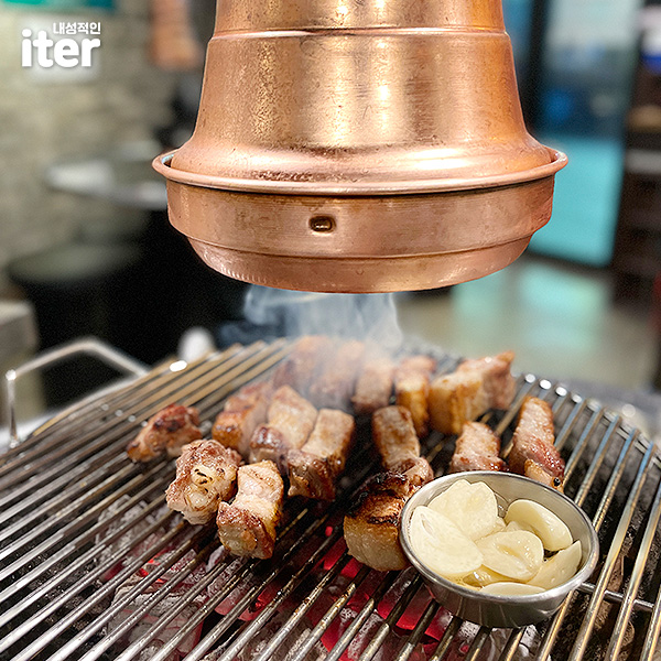 숯불로 구워주시는 고기는 진짜 맛있었습니다. 근데 제가 사실 약간 겉은 바삭하고 속은 촉촉한 고기를 좋아하는데 명지돈은 겉은 바삭하고 속은 약간의 퍽퍽함은 있었지만 고소했습니다. 맛있더라고요. 윤기도 좔좔 흐르고 좋았습니다.