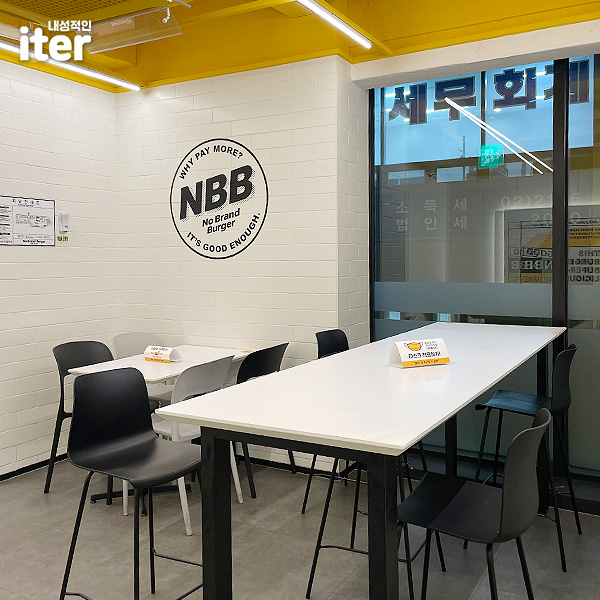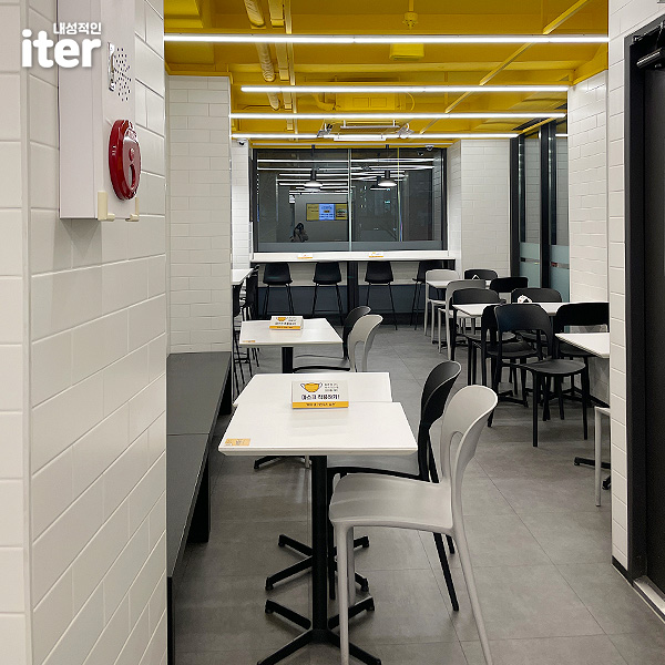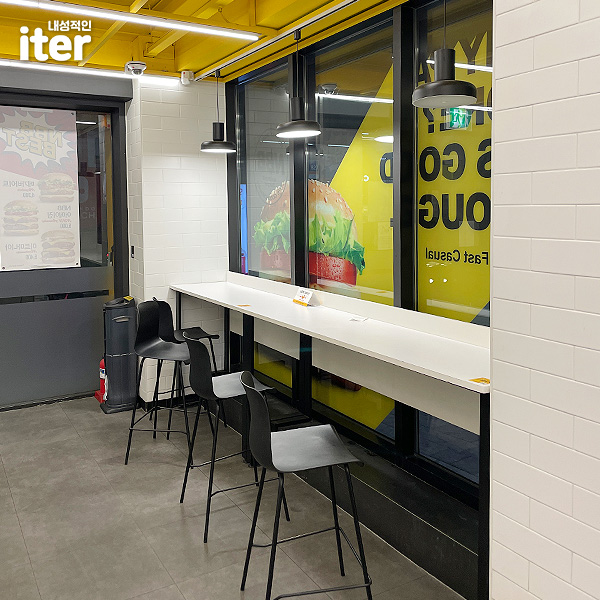 2층은 진짜 넓고 깔끔한 인테리어로 화이트&옐로 색감이었습니다. 사진으로 보는 것보다 앉을 곳도 많고 엄청 넓습니다. 노브랜드 버거 체인점 중에 여기가 제일 넓고 좋은 것 같습니다. 다른 곳은 많이 안 가봐서 잘 모르겠지만..