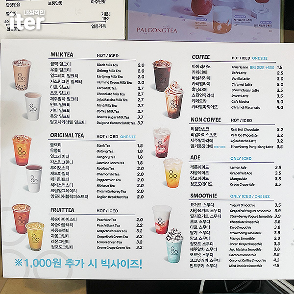 밀크티를 좋아하기도 하지만 팔공티는 가성비가 너무 좋아서 가끔 가는 곳이기도 합니다. 예전에 공차를 먹을 때가 있었는데 공차는 약간 가격이 있어서 자주 가질 못했습니다. 하지만 집 근처에 이렇게 가성비 좋은 밀크티 맛집이 있으니 공차 생각도 안 나더라고요ㅎㅎ