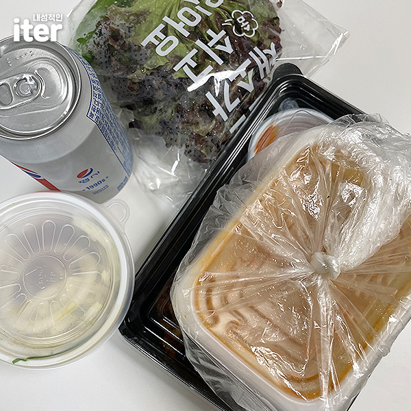 제가 시킨 메뉴는 돼지양념구이 고기 많이라는 메뉴를 시켰는데 이 메뉴의 구성은
