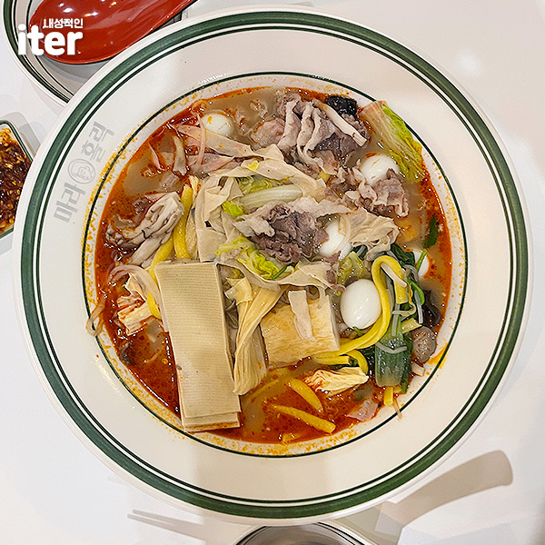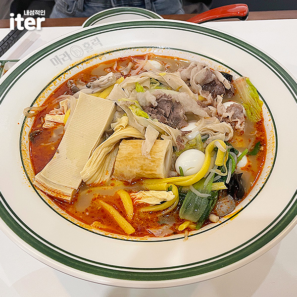 메인 메뉴 마라탕이 나왔습니다. 저녁 시간이라 배고파서 그랬는지.. 재료들을 너무 많이 넣어서 국물이 없었습니다. 근데 알고 보니 친구는 국물보다는 건더기 파였다는 사실.. 저는 국물 파인데 쥬륵.. 근데 여기 마라탕 맛있습니다.. 국물 파인 저도 건더기만 먹었더라는 후문이..