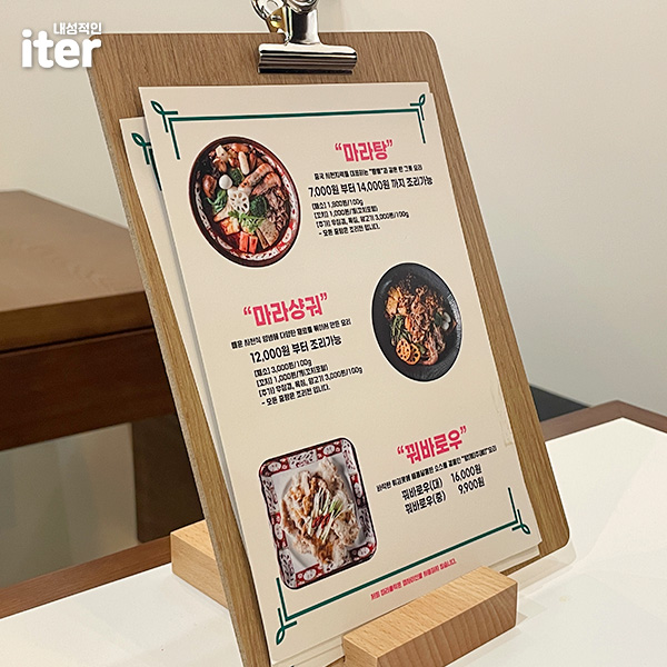 마라 홀릭은 메뉴판까지 깔끔합니다. 메뉴판이 집게로 되어 있어서 편한 것 같기도 하고 아닌 것 같기도.. 메뉴판을 보니 마라탕, 마라샹궈, 꿔바로우와 사이드 메뉴까지 알차게 있습니다. 저희는 마라탕 1개와 꿔바로우를 주문했습니다.