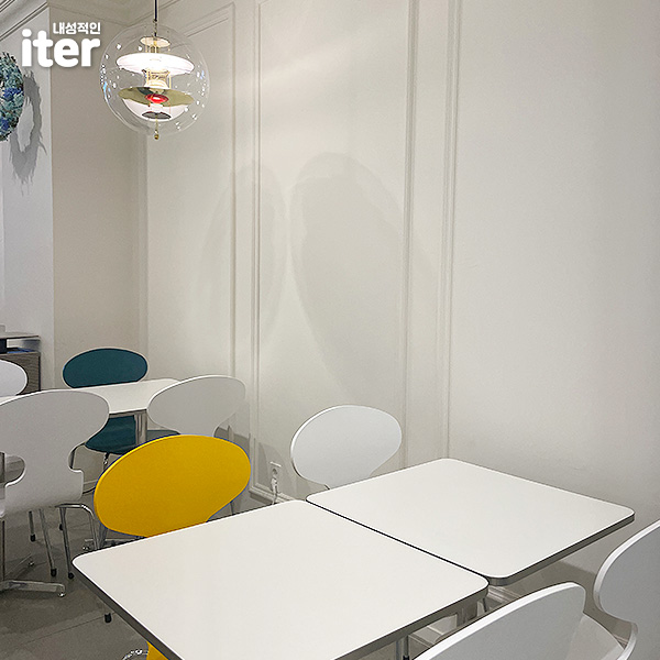 카페 내부 인테리어는 전체적으로 화이트톤에 중간중간 포인트 색감이 들어가 있었습니다. 카페를 많이 방문했지만 여기는 조명이 눈에 들어오더라고요. 신기한 조명.. 저런 건 어디서 구매할까요? 또 카페와 조명이 너무 잘 어울려서 계속 보고 있었습니다..