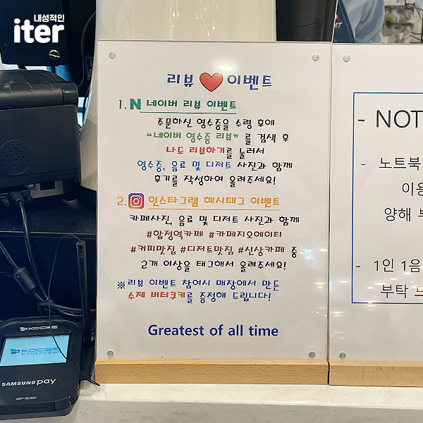주문하는 곳을 보니 리뷰 이벤트도 진행 중이더라고요. 네이버는 영수증 리뷰 이벤트를 하고 있습니다. 인스타그램은 필수 해시태그를 달고 사진을 올리면 매장에서 직접 만든 수제 버터쿠키를 주신다고 하니 리뷰 이벤트도 안 해볼 수 없겠습니다. 근데.. 저는 까먹고 얘기하다가 카페 마감시간이 다 되어서야 생각이 나서.. 아쉬웠습니다.