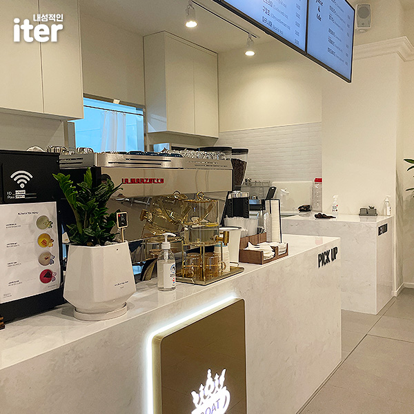 지오에이티 카페는 Greatest Of All Time의 줄인 말이었습니다. 블루블루한 청량감 있는 외관과는 다르게 내부는 정말 깔끔하고 넓고 좋았습니다. 조용하기도 해서 혼자 와서 책 읽어도 괜찮을 것 같습니다.