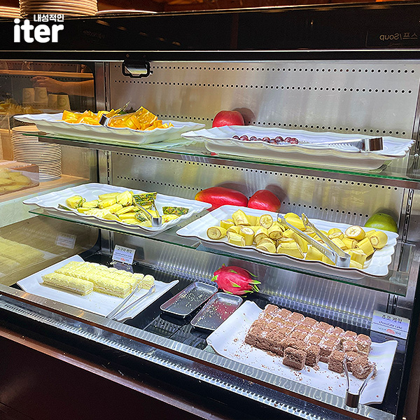 파인애플도 가져다 먹었는데.. 오렌지보다 더 새콤하고 맛있었습니다. 케이크도 있고, 바나나, 쿠키와 아이스크림, 팥빙수까지 있더라고요. 하지만 많이 먹지는 않고 배불러서 더 이상 못 먹을 때.. 파인애플만 가져다 먹었습니다.