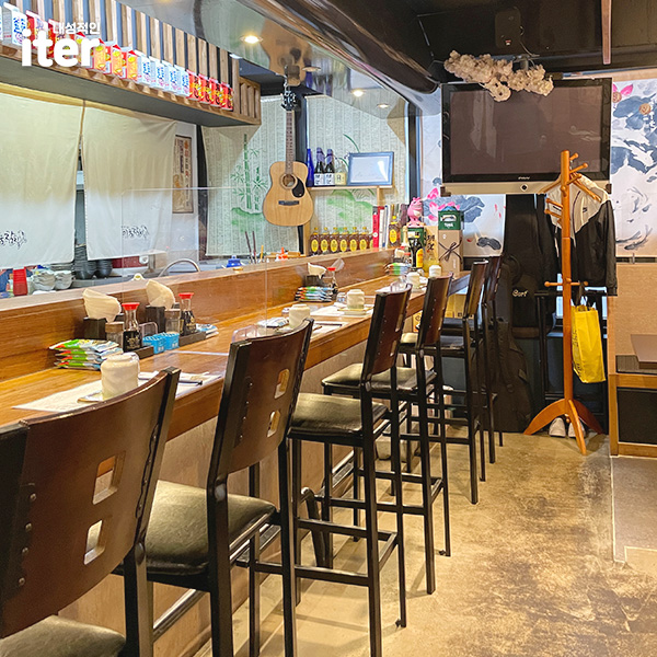 입구를 들어오니 바 자리가 바로 보이고 내부가 깔끔하고 넓어서 좋았습니다. 조명이 아늑한 느낌을 주더라고요. 참치랑 같이 먹을 수 있게 테이블마다 사조김도 한가득 놓여 있었습니다. 벌써부터 참치 먹을 생각에 두근두근..