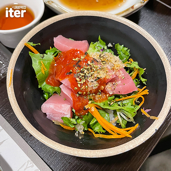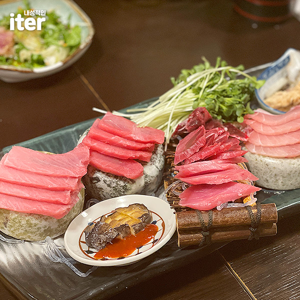 후토마키와 타다끼 샐러드, 콘치즈.. 메인 메뉴인 참치를 먹기 전 세팅되는 스끼다시는 너무나 푸짐하고 맛있더라고요. 배고파서 여러 가지를 많이 집어 먹었습니다. 콘치즈는 말해 뭐해 맛있고 꺅!