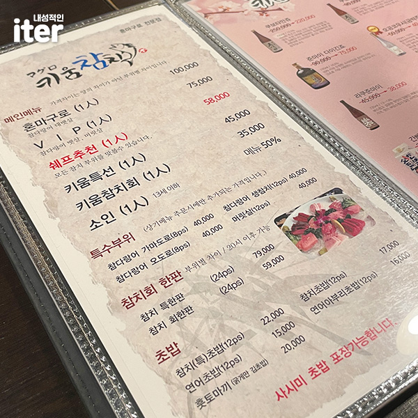 메인 메뉴에 있는 셰프 추천(1인 58,000원)으로!