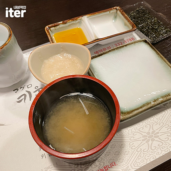 주문한 후에 바로바로 세팅해주십니다. 미소된장국과 죽! 그리고 소스까지ㅎㅎ 깔끔한 접시들이 더 눈에 보이네요ㅎㅎ 요새 접시에 빠져서 모든 쇼핑몰의 인테리어 카테고리에 접시들을 아이쇼핑하는데.. 암튼 다시 본론으로!