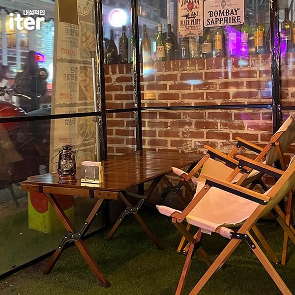 한쪽에는 사실 전신거울도 있어서 인증샷도 남길 수 있습니다. 저는 저를 안 찍어서.. 그런 인증샷은 못 남기지만.. 전체적으로 캠핑 분위기? 나는 의자도 있었는데.. 조금은 불편해서 자리를 옮겼답니다. 다리가 긴 분들은 앉기 불편하실 수도.. 제가 길다는 건 아니고.. 같이 간 지인이 길더라고요..
