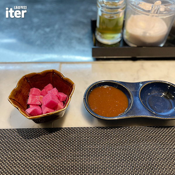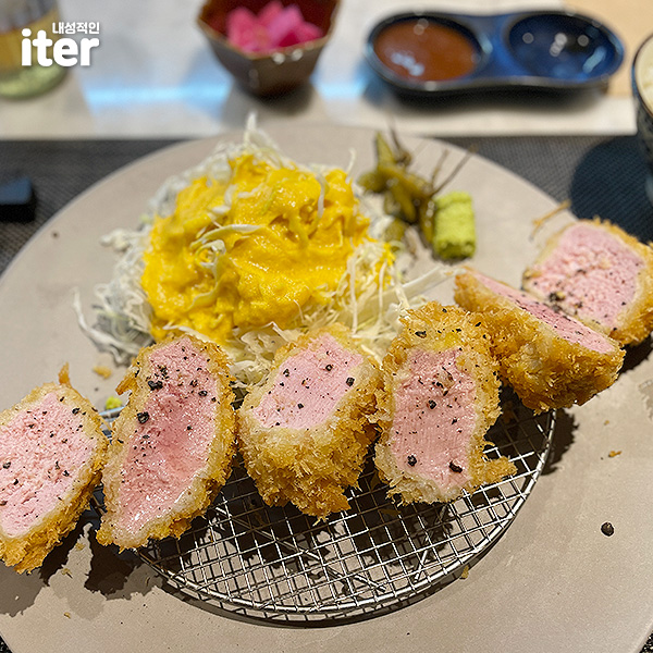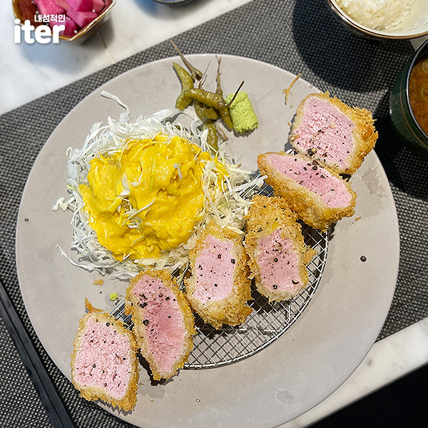 돈가스를 먹는 순간, 겉은 정말 바삭하고 속에 있는 고기는 부드러움의 끝판왕을 달리더라고요. 찾아보니 파동 숙성 방식으로 열흘간 숙성시킨 뒤에 신선한 기름에 튀겨 다시 오븐에 구워낸다는데 와.. 이건 먹어봐야 압니다! 진짜 강추드립니다!