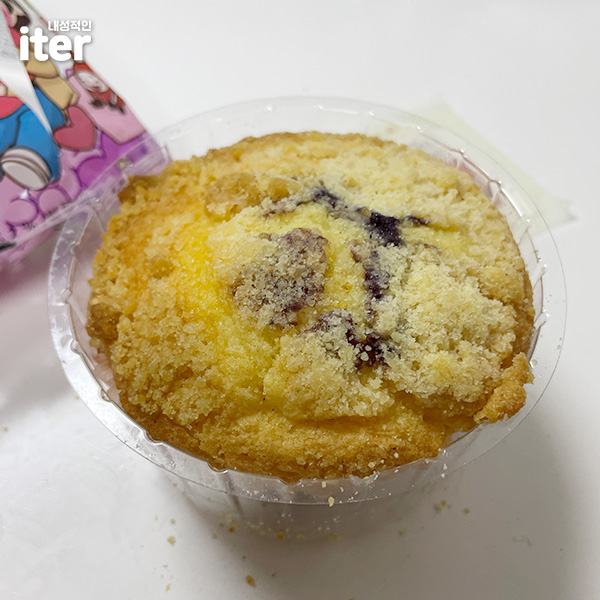 소보루 위에 올라가져 있는 느낌의 식감과 속을 보면 블루베리잼도 있어서 새콤하고 달콤하고 고소한 빵입니다. 머핀을 좋아하는데 이건 2천원의 느낌보다는 더 가격이 나가는 퀄리티 있는 느낌의 빵입니다! 너무 맛있습니다! 왕 추천!
