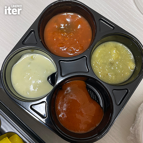 밑반찬과 여러 가지의 소스들을 줍니다. 다만.. 2가지 돈가스 중에 하나는 샐러드 소스가 없이 왔습니다. 그리고 경양식 돈가스에는 경양식 따뜻한 소스를 선택했는데... 기본 4가지 소스로 그냥 왔습니다. 경양식 돈가스는 따뜻한 소스랑 먹는 거라 그렇게 선택했는데ㅜㅜㅜ 배달도 너무 늦게 오고.. 그래서 너무 아쉬웠는데.. 또 맛은 있더라고요. 근데 거의 다 남겼습니다.. 경양식 돈가스는 정말 소스가 없으니 안 되겠더라고요....