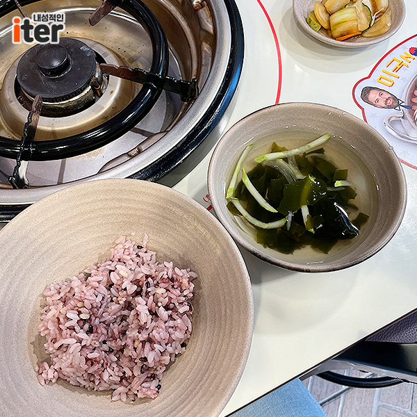 밑반찬들도 꽤 괜찮게 나오고 쌀이 검은 쌀이네요! 잡곡을 별로 못 먹으니 식당에서라도 검은 쌀, 현미를 찾게 되는 건 어쩔 수가 없나 봅니다. 집에서는 잘 못 먹기도 하고 먹기 싫어서 안 먹는 일이 많은데ㅎㅎㅎ..