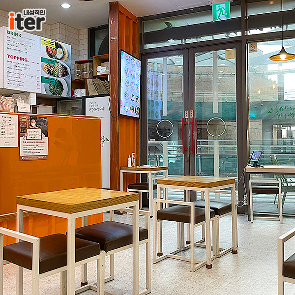 가게 내부인데 확실히 깔끔하고 가게가 넓더라고요. 물론 평일 저녁에 방문했는데.. 사람이 많이 없긴 했습니다. 테이블 사이도 넓고 좋았습니다. 메뉴도 다른 샐러드가게 보다는 많았습니다. 그래서 메뉴 고르는 데 엄청 시간이 오래걸렸어요ㅎㅎㅎ