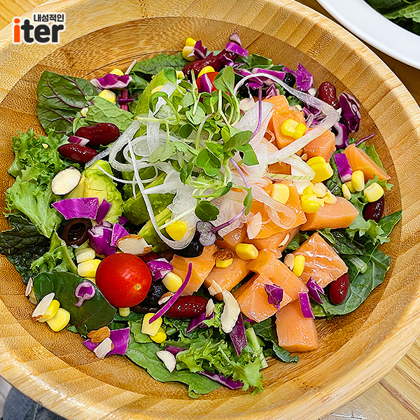 샐러드가 나오자마자 헉 했던건 양이 어마어마 하더라고요. 요새 샐러드 가격은 밥 값이라 먹기 참.. 애매하지만 그래도 샐러드는 맛있어요ㅎㅎㅎ 저는 연어는 다 좋아하는듯해요ㅎㅎ 샐러드도 연어를 먹으니.. 아채들도 다 아삭아삭하고 신선하더라고요. 다 먹으니 엄청 배불렀어요!