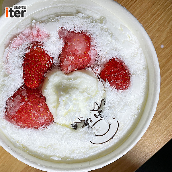 연유도 저렇게 귀여운 통에 담아서 왔어요! 너무 달달한 건 싫으니 살짝 넣어서 먹었는데 연유도 고소달콤하더라고요ㅎㅎㅎ 빙수 자체가 우유빙수여서 우유맛이 강한데 저는 흰 우유를 좋아하니 세상 맛있게 먹었습니다! 혹시나 느끼하다 싶으시면 딸기와 한 입 먹으면 악 넘 맛있어요ㅎㅎㅎ