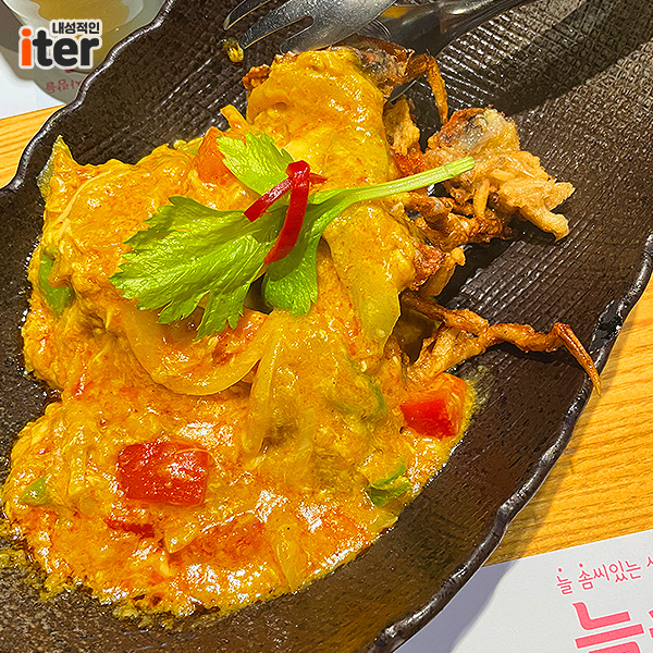 드디어 뿌 팟 봉커리가 나왔어요! 부드러운 소프트쉘 크랩을 껍질째 바삭하게 튀겨 옐로 커리와 함께 즐기는 태국의 대표적 요리라고 하네요! 평소에 먹어보지 못한 맛이라 독특하고 맛있더라고요. 색감도 이뻐서 음식 사진 찍기에도 좋고, 처음 먹어본 맛이었는 데 성공했네요!
