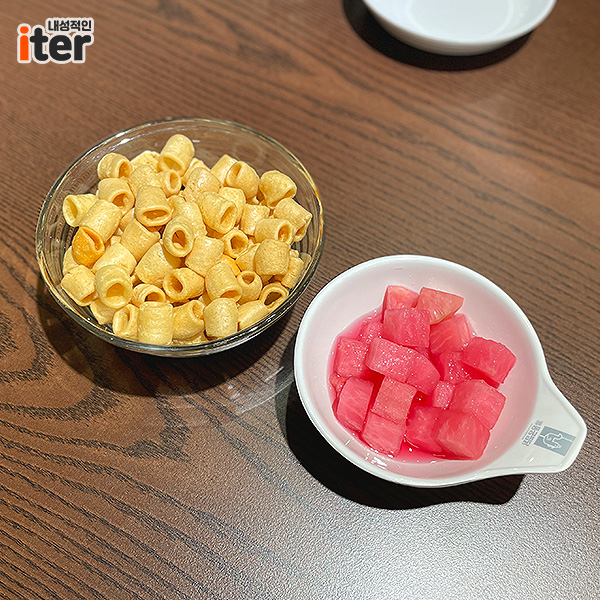새로 생긴 곳이라 그릇이며 수저, 젓가락 다 깨끗합니다! 너무 기분 좋아요ㅎㅎ 찜닭 나오기 전에는 이렇게 뻥튀기랑 무가 나옵니다! 사장님도 친절하셔서 좋았어요! 앞치마도 가져다주시고 찜닭에 당면을 빼 달라고 말씀드리니 다른 재료로 넣어주신다고 하시길래 저희는 치즈떡으로 변경도 했습니다!