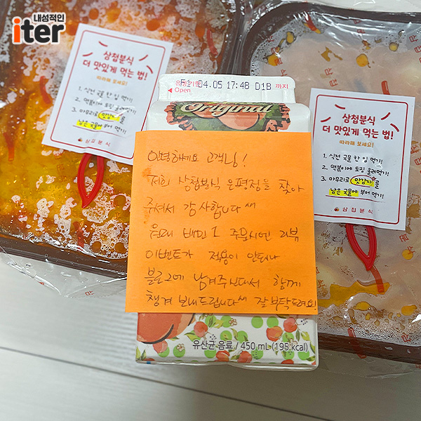 삼첩분식에 또 다른 정성은 수저를 정성스레 주셔요... 패키지나 수저를 이렇게 주시면 남는 게 있을까도 생각이 들지만... 받았을 때 너무 기분 좋아서ㅎㅎ 사진 찍는데 떡볶이 냄새가 너무 좋아서... 하나하나 찍기 너무 힘들었답니다... 빨리 먹고 싶어 가지고...ㅋㅋㅋ