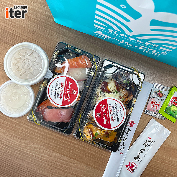 오늘은 저번과는 다르게 칸도 초밥을 시켜봤습니다! 많이 먹는 저에겐... 히로미 초밥이 딱이란 걸 알았지만... 회사 점심이기엨ㅋㅋ 많이 먹으면 졸릴까 봐 참았어요... 스시노 칸도 초밥은 와사비가 들어가 있지 않아서 생선 식감이나 냄새를 더 잘 음미하며 먹었던 것 같아요!