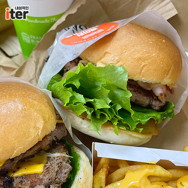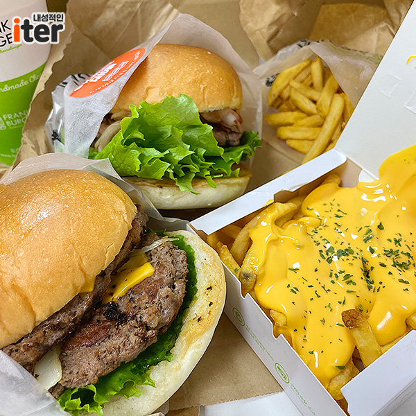 저도 포장을 이용했는데요. 프랭크 버거만의 수제 패티가 엄청 두툼하고 맛있는데 저 치즈 프렌치프라이 보이시나요?ㅎㅎ 치즈를 좋아하는 저는 그냥 프렌치프라이를 치즈 프렌치로 바꿔 먹었답니다! 제가 시킨 두 버거도 바로 소개해드리겠습니다!