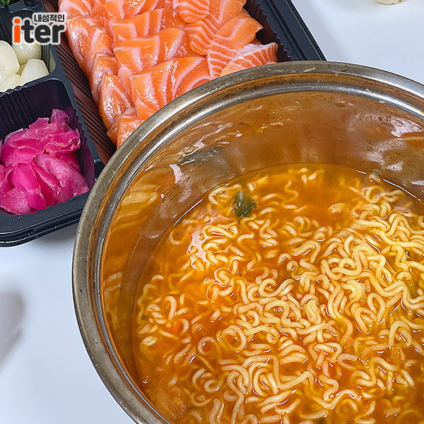 연어 사시미 하나만 먹기는 너무 아쉬워서 콩나물 김치라면이랑 같이 먹었습니다! 이 라면은 그렇게 맛있진 않아요ㅜㅜ 먹을만합니다.. 약간 콩나물 라면이라 시원함이라는 단어보다는 김치 컵라면에 좀 신듯한 맛? 이여서.. 기대보단 별로여서 아쉬웠어요..
