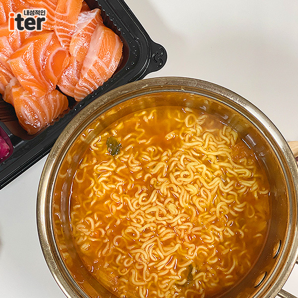 연어는 오래 먹다 보면 좀 물리고 느끼하잖아요? 그래서 라면이랑 같이 먹는 거였는데 이거.. 콩나물김치라면 면은 진짜 꼬들꼬들 그 자체입니다ㅎㅎ 그래도 신라면이 연어와 더 잘 어울리지 않았나 생각해봅니다ㅎㅎ 그래도 매콤한 라면이 들어가니 물리던 연어가 다시 들어가더라고요ㅎㅎ 남김없이 다 먹었죠!