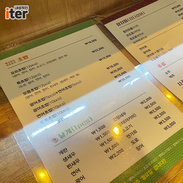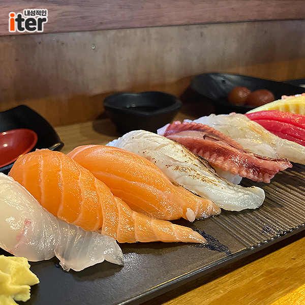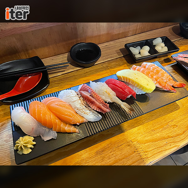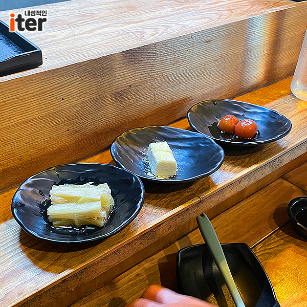 기본으로 나오는 스끼다시 3개는 초밥이랑 같이 먹기 진짜 좋았어요ㅎㅎ 가운데 있는 건 치즈인 것 같던데.. 제 스타일:) 처음엔 뭐지뭐지 하다가 먹고는 오오 하는 맛?ㅋㅋㅋ 아무튼 초밥 먹을 생각에 너무 신이 나서 다 맛있어 보였던ㅎㅎㅎ
